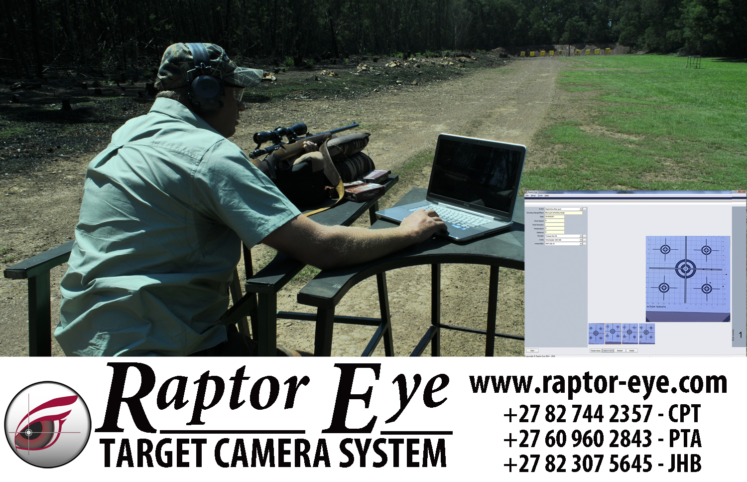 Our target camera is setup down range at your target and you can then view each and every shot fired to your target on your laptop or handheld device from your shooting station. No more walking up and down to view your shots. No more struggling to view your shots with a spotting scope. Saving you time and money. Each shot fired is indicated by a blinking indication where your last bullet has entered the target. Please vissit our website at www.raptor-eye.com for more details on our product.